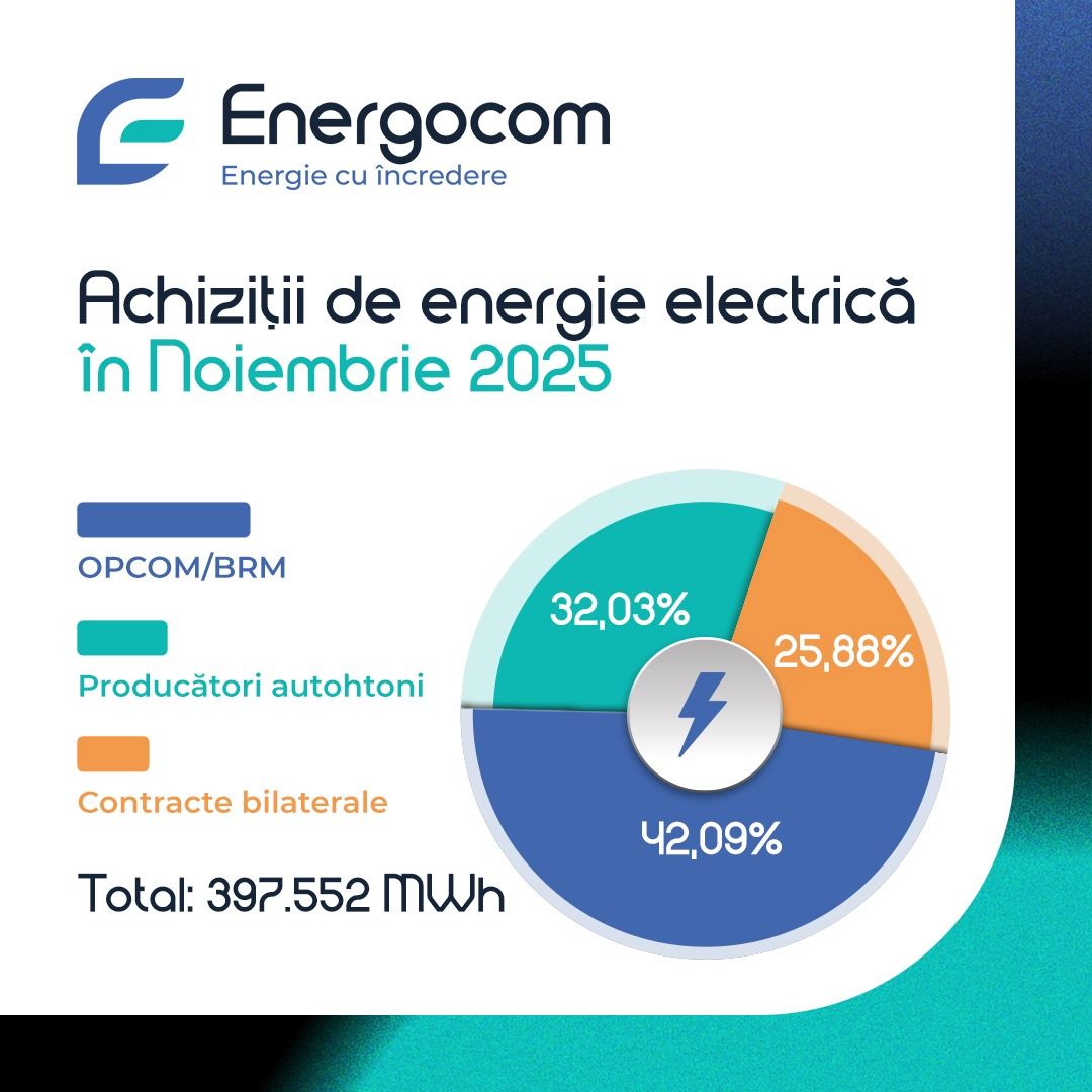 În luna noiembrie 2025, S.A. „Energocom” a achiziționat circa 397,552 mii MWh de energie electrică, provenind atât din surse interne, cât și din importuri, la un preț mediu ponderat de 134,70 EUR/MWh.
